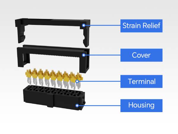 IDC W/O Strain Reli,其中公端和母端使用 IDC 技術(shù)直接連接,支持 AWG 28-22 的線(xiàn)規(guī),將裝配效率提高 30%。