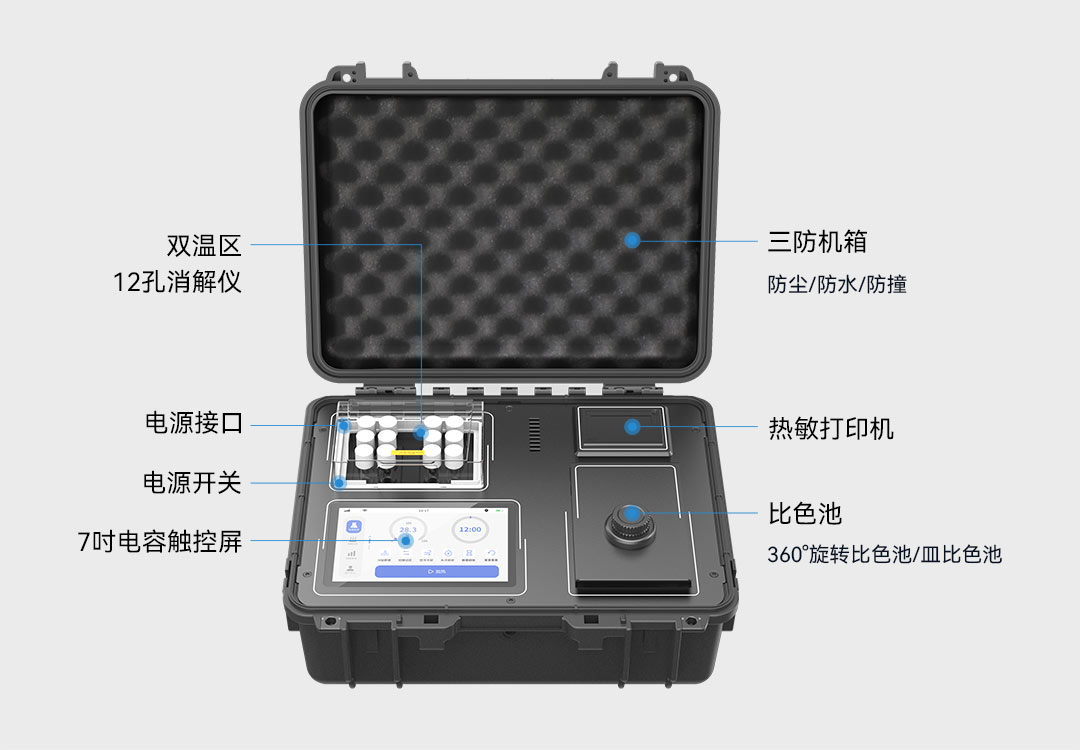 雙便攜箱設計,為戶外水質檢測提供了強大的戶外應用支持,該儀器具備雙溫區消解功能,6+6孔雙溫區設計,可以滿足多指標消解的需求。此外,儀器還內置了大容量鋰電池,綜合工況下工作續航能力長達8小時,為戶外長時間使用提供了強有力的支持。