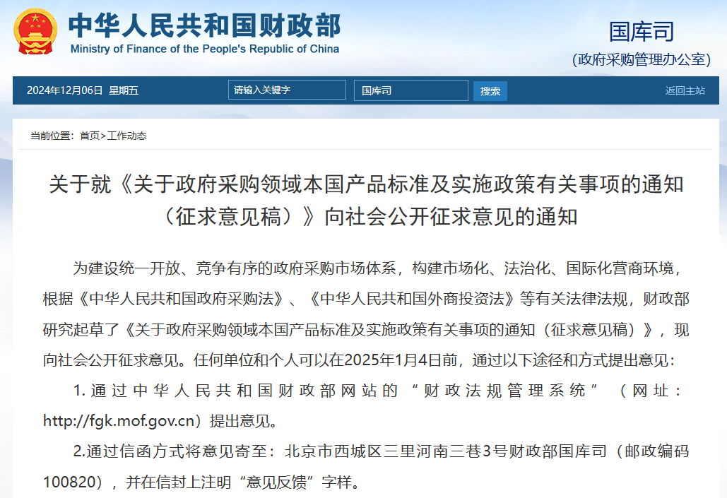近日,財(cái)政部在其官方網(wǎng)站上發(fā)布了《關(guān)于政府采購(gòu)領(lǐng)域本國(guó)產(chǎn)品標(biāo)準(zhǔn)及實(shí)施政策有關(guān)事項(xiàng)的通知(征求意見(jiàn)稿)》,并向社會(huì)各界公開(kāi)征求意見(jiàn)。該通知旨在構(gòu)建統(tǒng)一開(kāi)放、競(jìng)爭(zhēng)有序的政府采購(gòu)市場(chǎng)體系,保障各類(lèi)經(jīng)營(yíng)主體平等參與政府采購(gòu)活動(dòng),并明確提出在政府采購(gòu)活動(dòng)中,給予本國(guó)產(chǎn)品相對(duì)于非本國(guó)產(chǎn)品20%的價(jià)格評(píng)審優(yōu)惠。