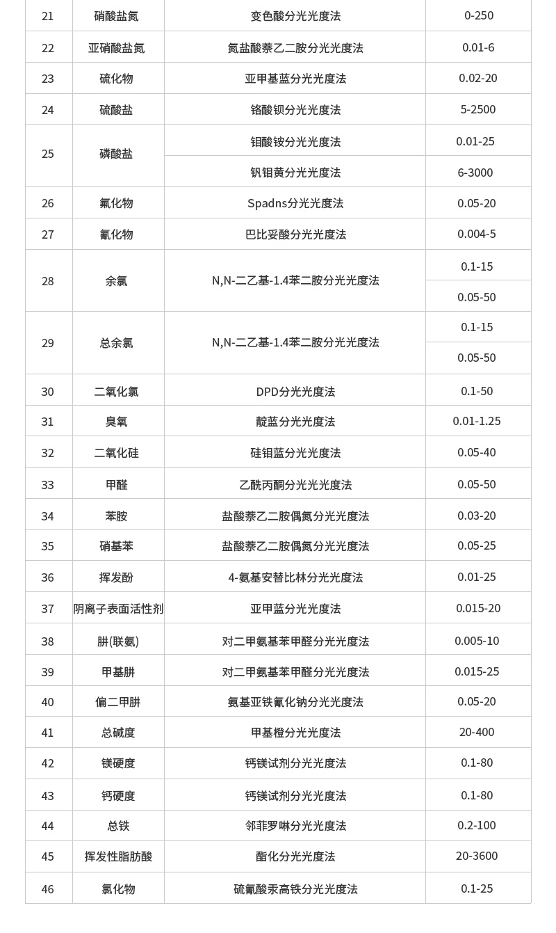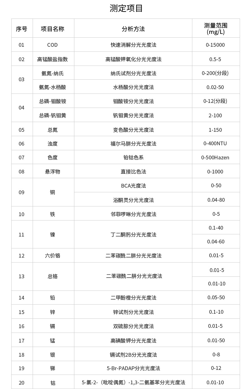 1、46項(xiàng)指標(biāo):直接測(cè)定化學(xué)需氧量(COD)、氨氮、總磷、總氮、懸浮物、色度、濁度、重金屬、有機(jī)污染物和無機(jī)污染物等多項(xiàng)指標(biāo),濃度直讀;